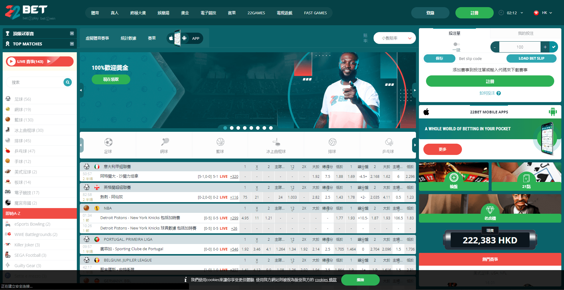 22 BET是一相當知名的在線博弈平台,它的最大特色在於平台中擁有眾多的體育博弈可供玩家做選擇,玩家們再也不用像過往那樣需要註冊多個在線平台才能滿足想要投注體育賽事的需求,有了22 BET便可一站全到位。